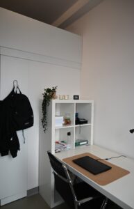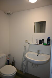 De kamer is voorzien van eigen douche, toilet en lavabo en heeft een bewoonbare oppervlakte van 16 vierkante meter. Om te slapen moet je een trapje hoger gaan, op de hoogslaper. Dit is ideaal! Je hebt meer ruimte in je kamer en je bent niet verplicht je bed op te maken voor bezoek;-)