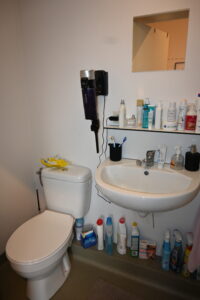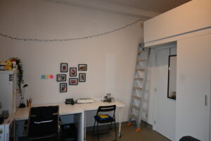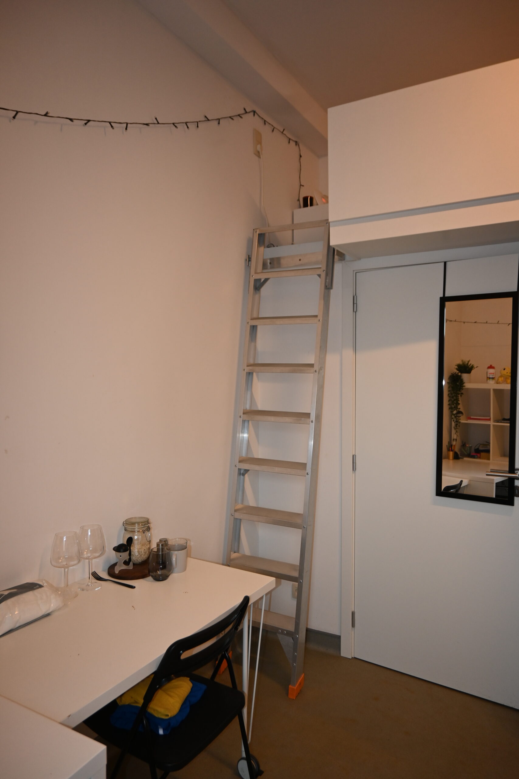 De kamer is voorzien van eigen douche, toilet en lavabo en heeft een bewoonbare oppervlakte van 22,5 vierkante meter. Om te slapen moet je een trapje hoger gaan, op de hoogslaper. Dit is ideaal! Je hebt meer ruimte in je kamer en je bent niet verplicht je bed op te maken voor bezoek;-)